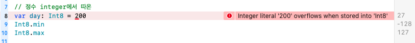 Int8은 signed(부호있는) integer이기 때문에 -128부터 127까지 저장할 수 있다.