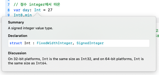 또한 Int의 (option 누르고 나오는) Discussion에서 32-bit 플랫폼에서는 Int32랑 같고, 64비트 플랫폼에서는 Int64랑 같다고 한다.