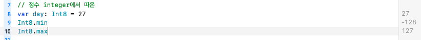 저 중에서 Int8을 골라서 이 자료형에 저장할 수 있는 데이터 최소, 최대값을 알려면 .min, .max을 입력하면 된다.