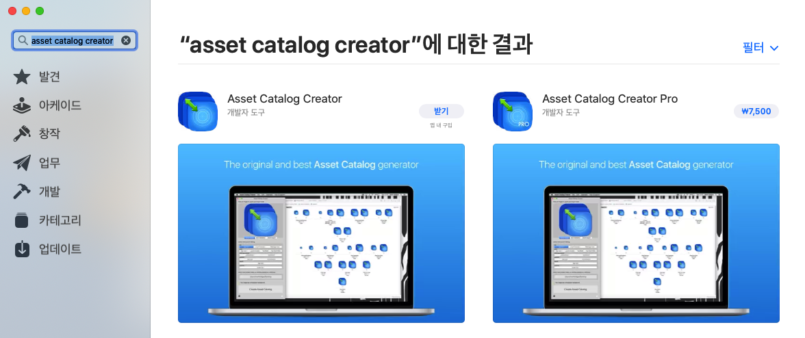 먼저 asset catalog creator은 앱 스토어에서 다운받는다.