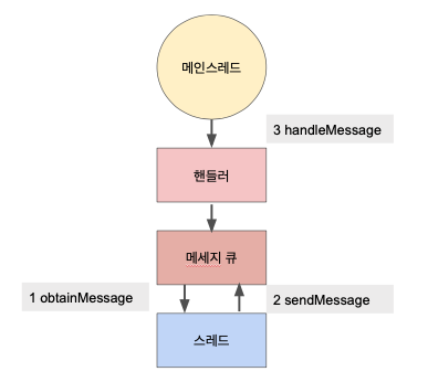 - 새로 만든 스레드 객체에서 수행한 작업의 결과는 핸들러 객체의 obtainMessage()로 참조하고, sendMessage()로 메세지 큐에 넣게 됩니다.