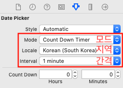 데이트 피커를 선택하면 뜨는 오른쪽 창에서 [Attributes inspector]에서 설정하면 됩니다.