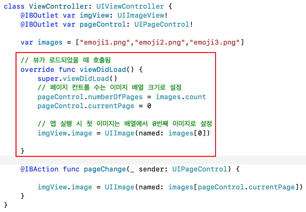 - 뷰가 보였을 때 호출되는 함수는 viewDidLoad입니다.
