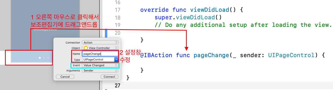 - 여기서는 선택할 페이지 컨트롤의 값이 변할 때 액션 함수를 실행하기 위해 [Value Changed] 를 선택했습니다.