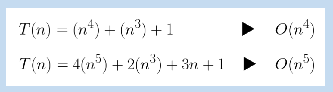 그럼 이제 수식을 보고 빅-오를 구할 수 있겠죠? T(n)이 다항식으로 표현된 경우, 최고차항의 차수가 빅-오가 됩니다.