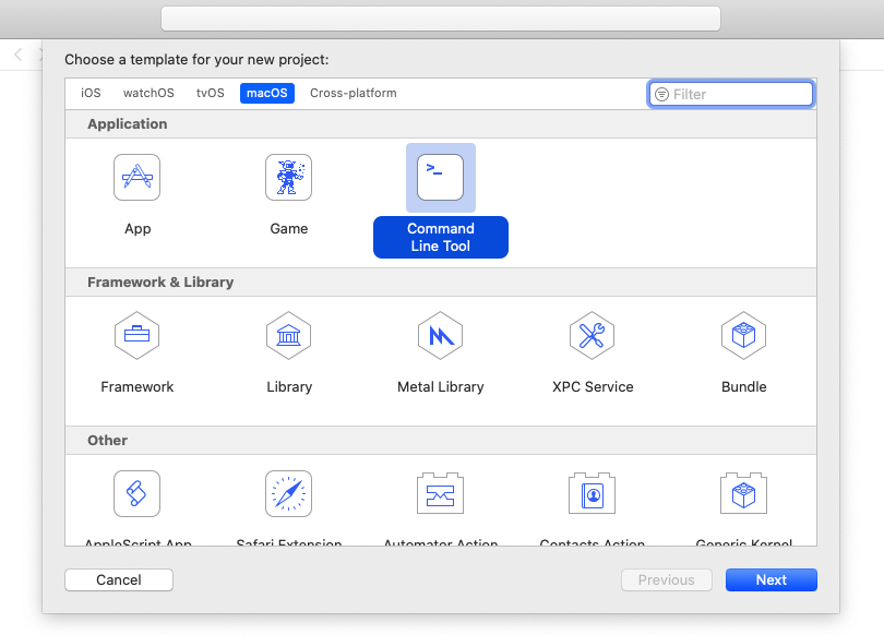 3. macOS - Command Line Tool 를 선택하고 Next를 클릭합니다.