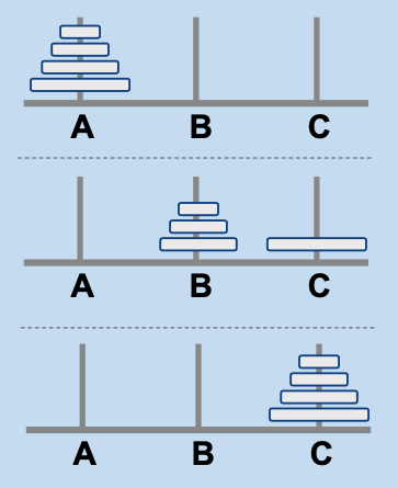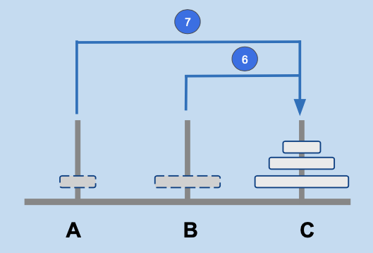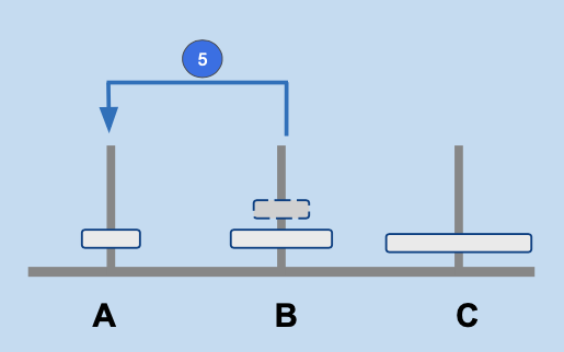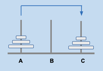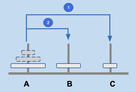 막대 A에서 막대 C로 옮기기 위해서 막대 B를 잘 활용해야 합니다.