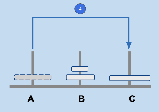 4번째 원반을 막대 C로 옮기는 것이 우선이니 일단 원반 1,2,3번을 막대 B로 옮겨야 합니다.