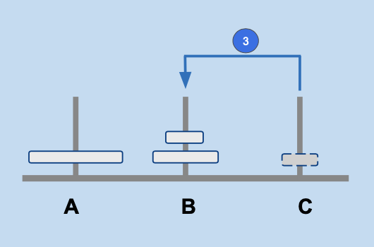 2. 막대 B에 있던 작은 원반을 막대 C로 옮긴다.