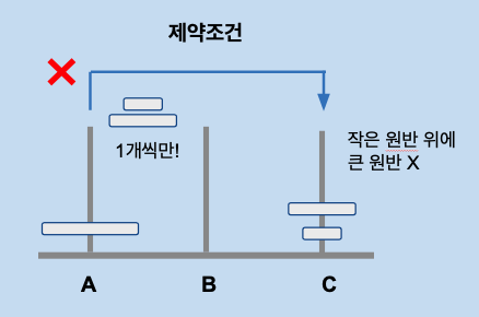 하나의 막대에 쌓여 있는 원반을 다른 막대에 그대로 옮겨야 하는 문제인데,