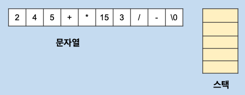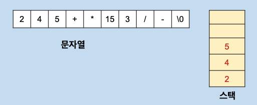 | 2 4 5 + * 15 3 / - | (후위 표기법) |