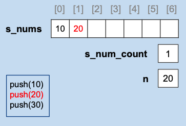그 다음 push(20)을 하면 s_nums[1] 자리에 20이 들어갑니다.