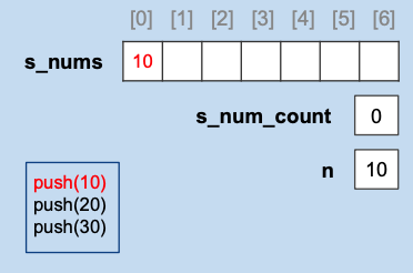 push(10)를 하면 스택 0자리에 10이 들어갑니다. 다음 데이터를 넣을 자리를 가리키는 s_num_count가 1 증가합니다.