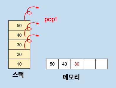 데이터가 들어있는 스택에서 위에부터 하나씩 꺼냅니다. 50, 40, 30 순이 되겠지요.