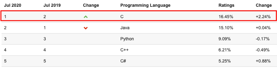 C언어는 TIOBE 지수(프로그래밍 언어 순위)로 2019년에는 2위였다가 현재 2020년은 1위 입니다.