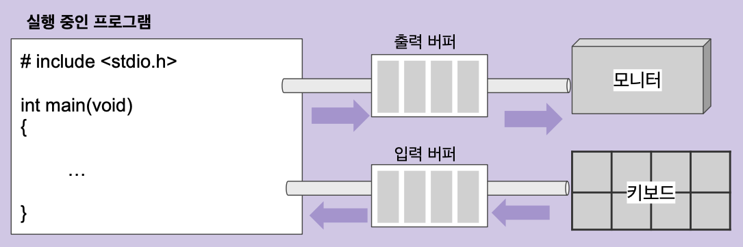 우리가 이제껏 공부해 온 입출력 함수들은 ANSI C의 표준에서 정의된 함수입니다. 이런 표준 입출력 함수를 통해서 데이터를 입출력하는 경우, 해당 데이터들은 운영체제가 제공하는 '메모리 버퍼'를 중간에 통과하게 됩니다. 여기서 말하는 '메모리 버퍼'는 데이터를 임시로 모아두는(저장하는) 메모리 공간입니다.