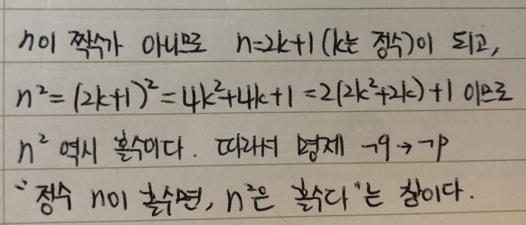 ~q→~p: 정수 n이 홀수이면, n^2는 홀수다.
