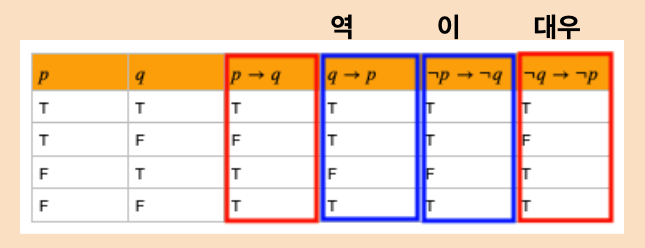 빨간네모: 대우명제는 본 명제와 같은 진릿값을 갖습니다.