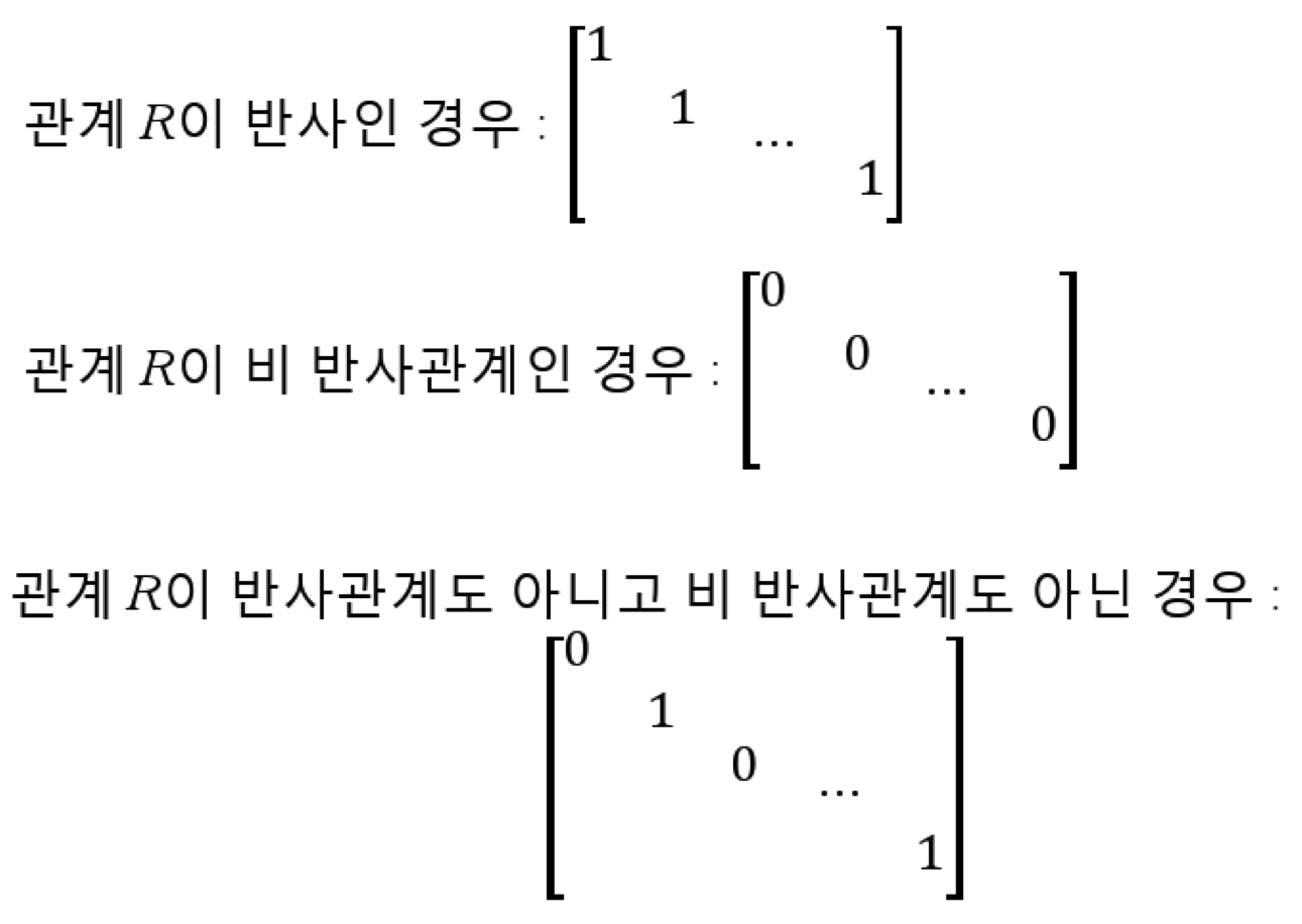집합 A에 포함된 모든 원소에 대해 (a. a)가 관계 R에 존재하지 않는 관계입니다. 그러므로 집합 A에 포함되는 원소 중 하나라도 (a, a)가 관계 R에 존재하면 비반사관계가 될 수 없습니다.