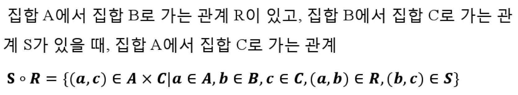 세 개 이상의 집합이 관계가 있을 때, 이 관계로 새로운 관계를 만들어내는 것을 합성관계라고 합니다.