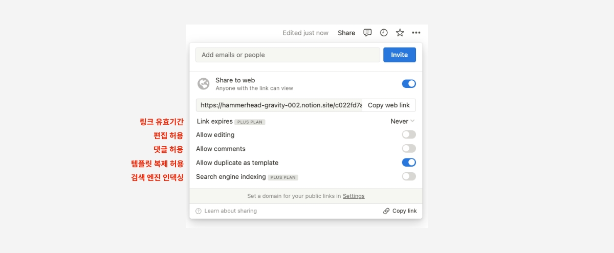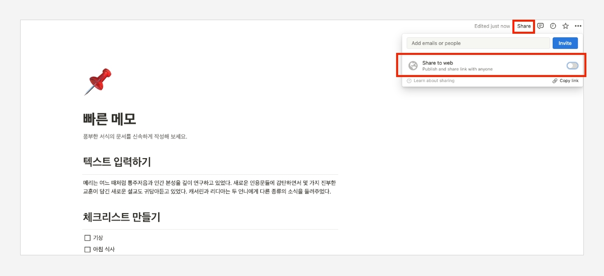 2 '웹으로 공유하기'에 토글을 움직여 활성화합니다.