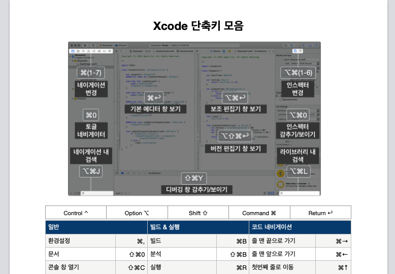 Xcode 프로그램을 사용하여 프로그래밍할 때 단축키를 활용한다면 코드 작성 시간을 단축할 수 있습니다. 그래서 Xcode 단축키 모음을 PDF 한 장으로 만들어보았습니다. 기존의 영문으로된 원본을 한국어로 해석했습니다.