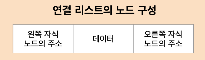 연결리스트는 왼쪽 노드와 오른쪽 노드를 가리키는 포인터 영역과 데이터를 저장하는 데이터 영역으로 구성됩니다. 하지만 잎 노드의 경우 자식 노드를 갖기 않기 때문에 자식 노드 주소가 null로 채워집니다.