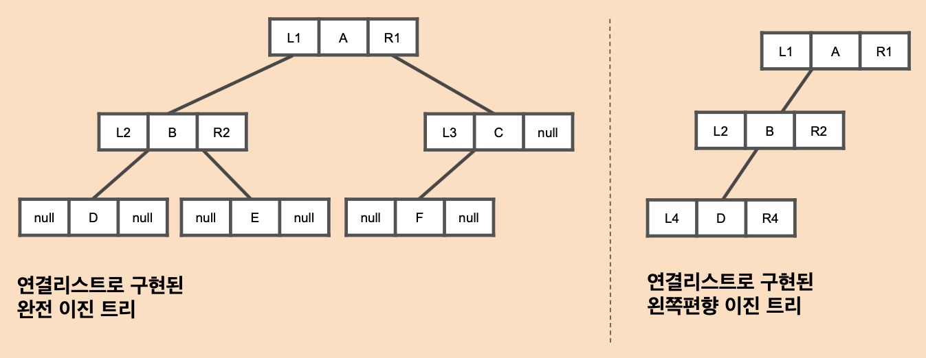 연결리스트는 부모 노드와 자식 노드 간에 주소(포인터)로 연결되어 있기 때문에 편향 이진 트리라 하더라도 메모리를 낭비하지 않고 구현할 수 있습니다. 또한 부모 노드의 주소 영역만 변경하면 노드를 삽입하거나 삭제할 수 있기 때문에 배열로 구현한 이진 트리에 비해 훨씬 효율적입니다.