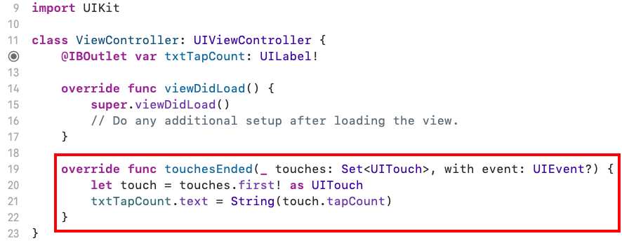 txtTapCount.text = String(touch.tapCount) // touches 세트 안에 포함된 터치의 개수를 출력합니다.