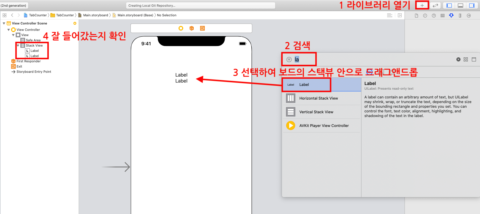 4번에서 스택뷰 안에 Labeldl 들어가지 않으면 드래그로 변경해줍니다.