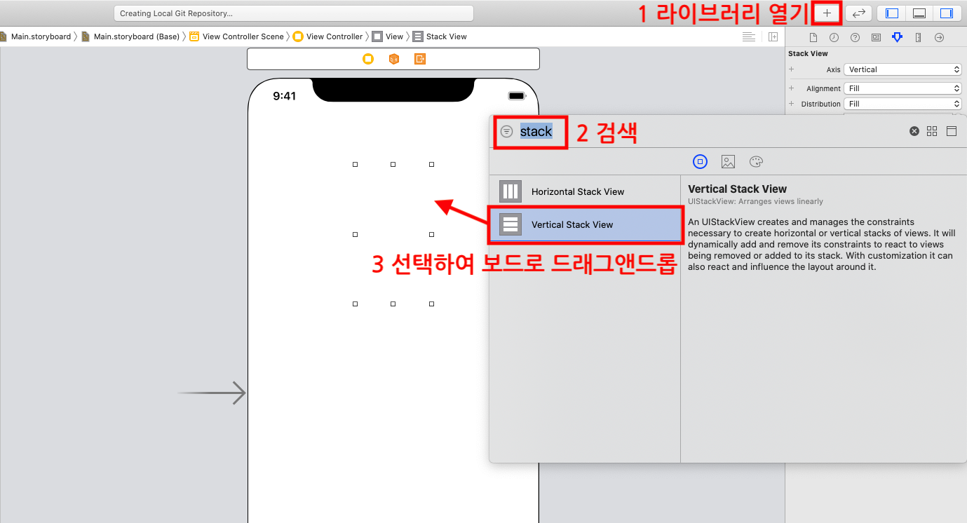 STEP1 라이브러리에서 스택뷰(Vertical Stack View)를 드래그하여 스토리보드에 드래그합니다.