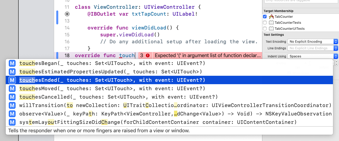 자동 완성기능을 이용하여 touchesEnded를 선택하면 됩니다.