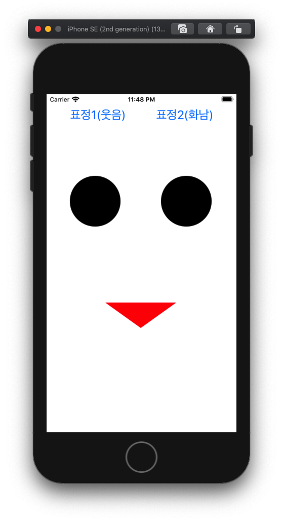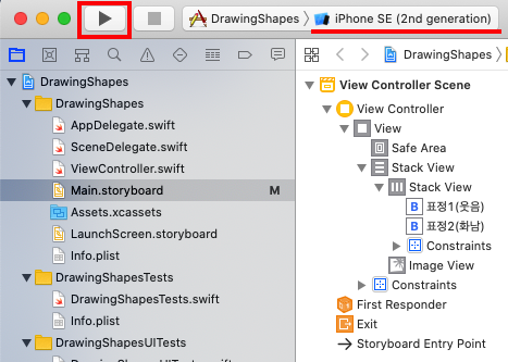 상단 ▶ 버튼을 클릭합니다. 시뮬레이터 기기는 iPhone SE입니다.