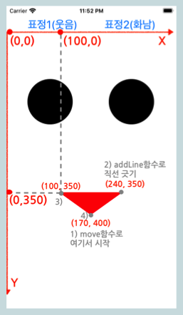 입을 그리기 위해서 거꾸로된 삼각형을 그릴 것입니다. 시작위치를 (170,400)로 합니다. (iphoneSE기준)