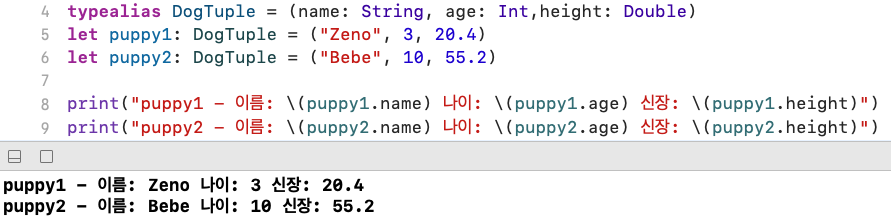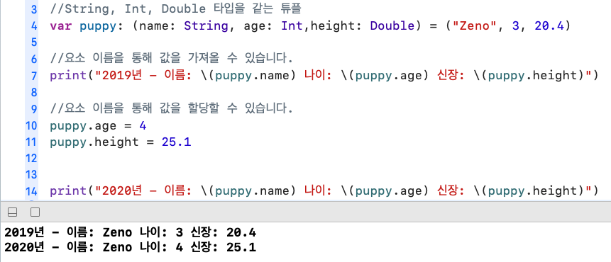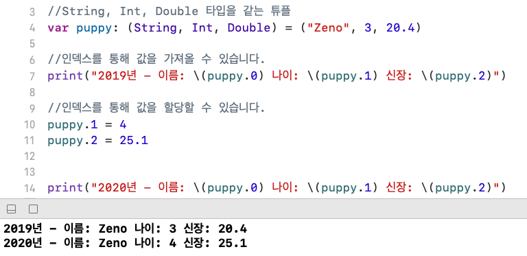 print("2020년 - 이름: \(puppy.0) 나이: \(puppy.1) 신장: \(puppy.2)")