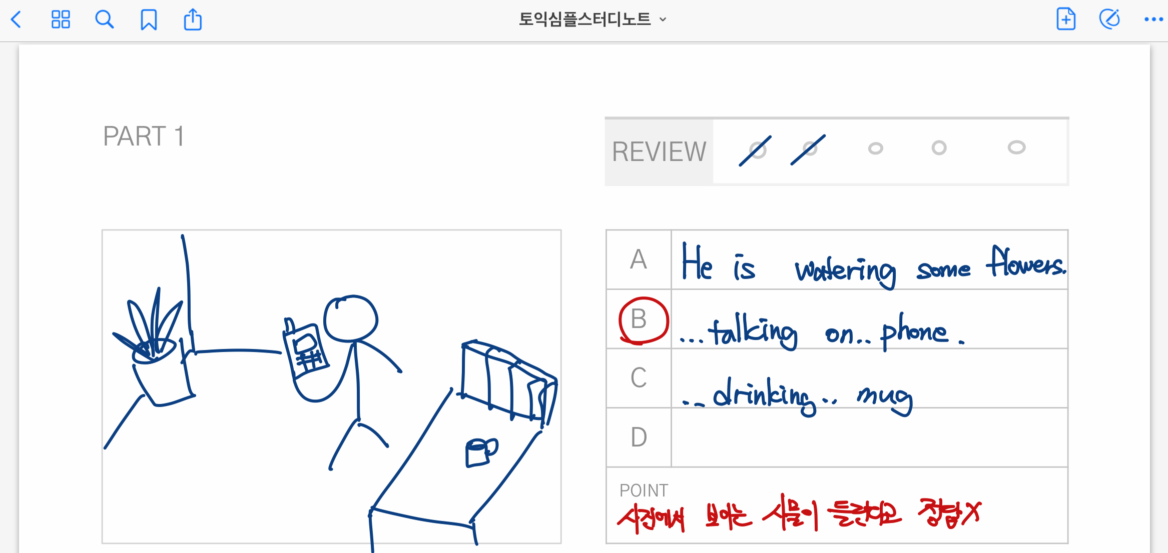 아래 양식처럼 왼쪽에 간단히 문제의 그림을 그리고, 오른쪽 각각 보기를 딕테이션(받아쓰기)하면 됩니다. 답이 되는 문장에는 하이라이트를 쳐서 다음 볼 때는 빠르게 훝으면서 '이 그림에 대한 묘사로 이런 문장이 쓰였구나'하며 복습하시면 됩니다.