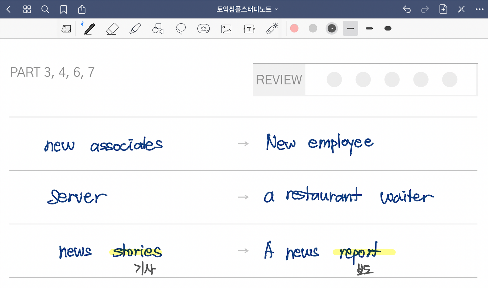 토익 듣기 학습 과정 중에 오답노트 작성이 있습니다. 따라서 '토익 듣기는 딕테이션만 하면 된다!'가 아니라 틀린 문제를 확실히 짚고 넘어갈려면 따로 정리해야 해야한다는 점을 언급하고 싶었습니다. 문제집을 통으로 복습하기는 어렵기 때문에 간단하게 정리한 노트를 활용하면, 특히 디지털 파일이라면 쉽게 반복 학습할 수 있기에 추천드립니다.