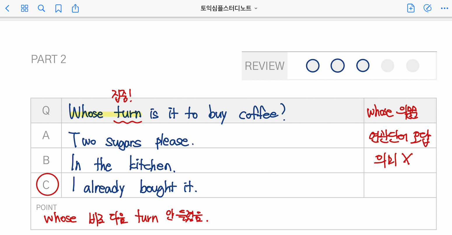 파트 2의 오답노트는 딕테이션 노트라고도 볼 수 있는데요. 여기서 받아 쓰기만 해서는 안 되고, 질문 유형 / 오답 유형까지 파악하여 메모해야 합니다. 이 과정을 반복하다보면 어떤 새로운 파트2 문제를 풀더라도 듣자마자 머리 속으로 유형별로 정리가 되면서 답을 예상할 수 있습니다. 그럼 높은 정답율에 문제 푸는 속도까지 올릴 수 있습니다.