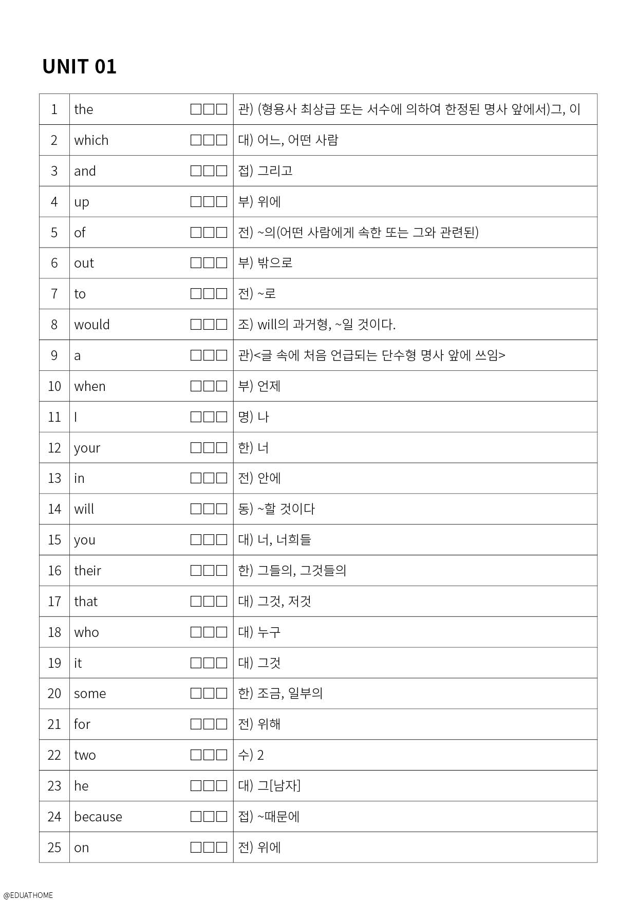 한 페이지에 25개의 단어가 있기 때문에 본인의 학습 속도에 맞게 적당히 분량을 정하기 좋습니다. 잘 외워지지 않는 단어는 중간의 네모칸에 체크하여 난이도를 표시하세요.