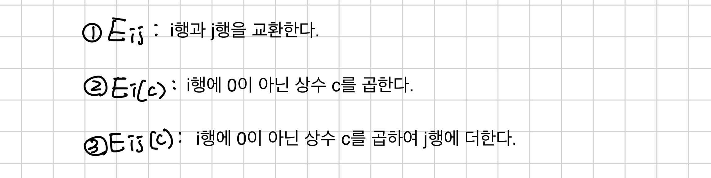 첨가행렬(agumented matrix)을 다음과 같은 방법으로 변화시키는 것을 기본 행 연산(elementary row operation)이라고 한다.