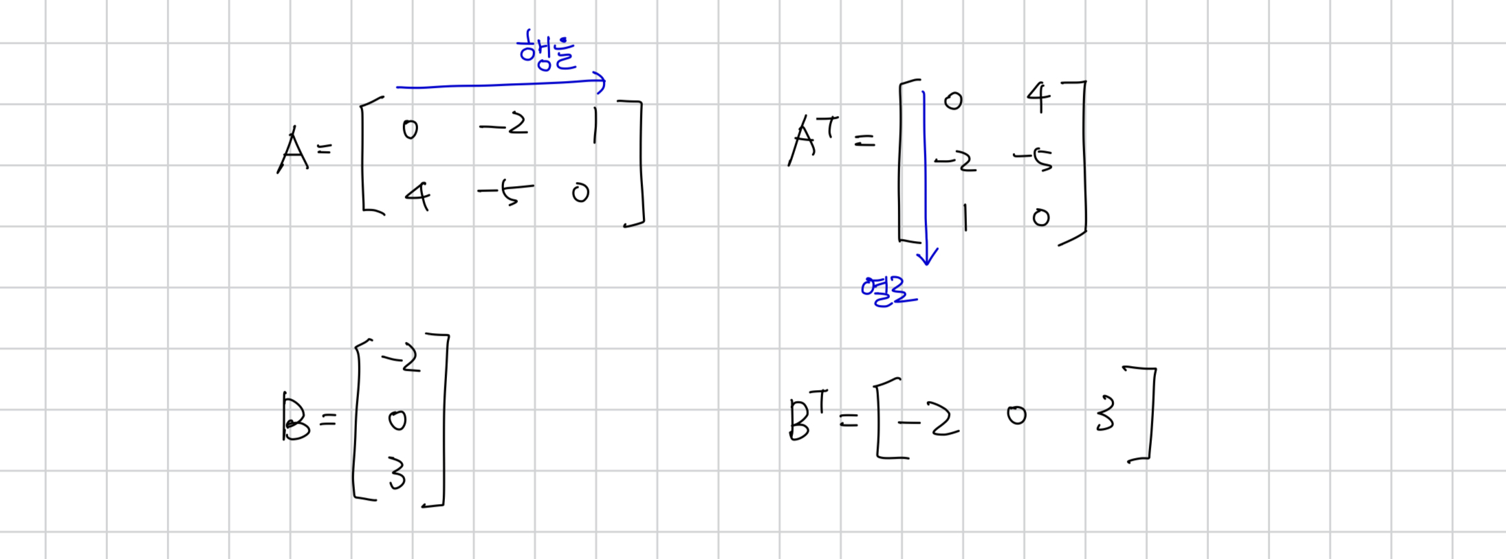 전치행렬 (transpose matrix)은 행렬 A의 행과 열을 바꾸어 만든 행렬이다. A^{T}로 표기한다.