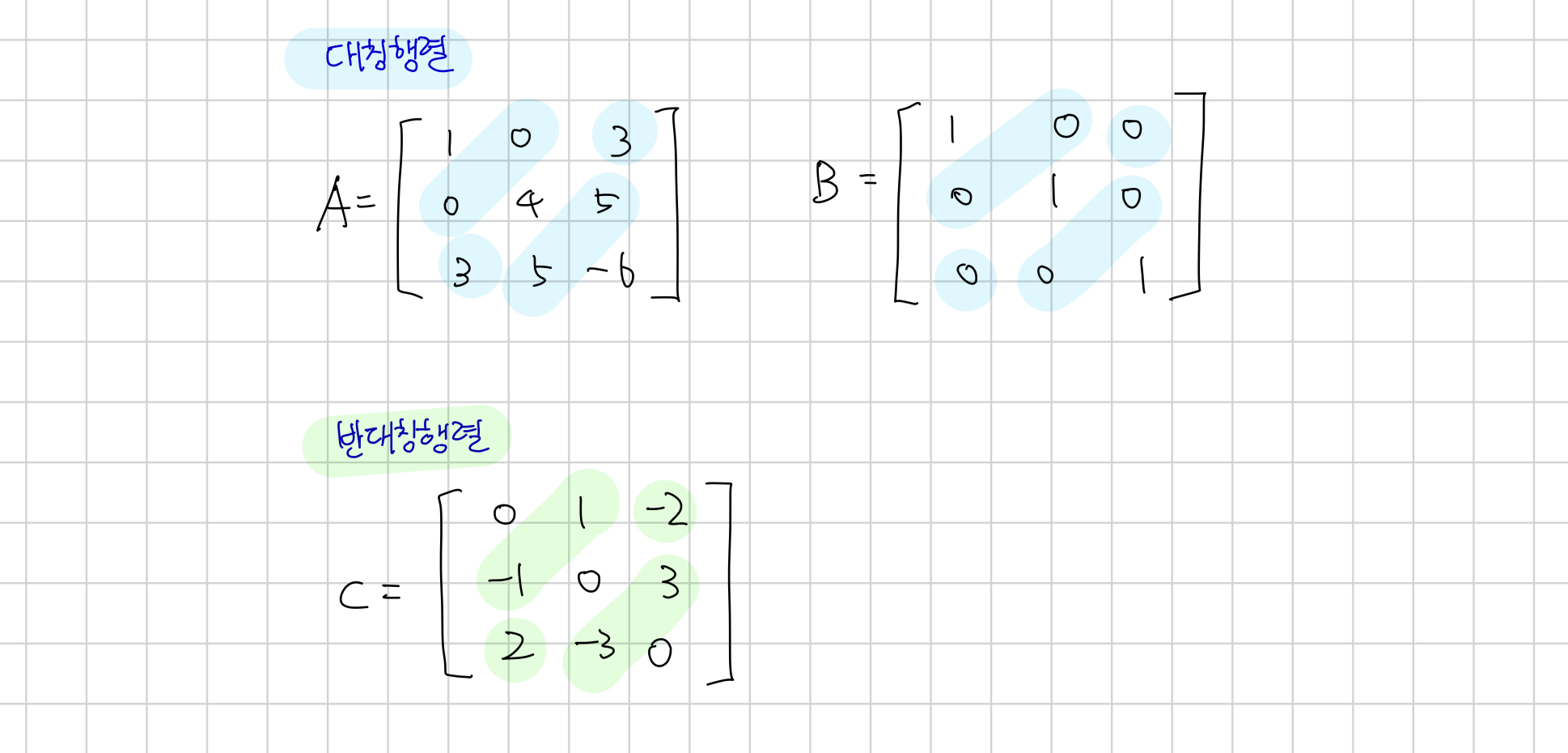 대칭행렬 (symmetric matrix)은 주대각선 성분을 기준으로 대칭인 위치에 있는 성분이 서로 같음을 의미한다.