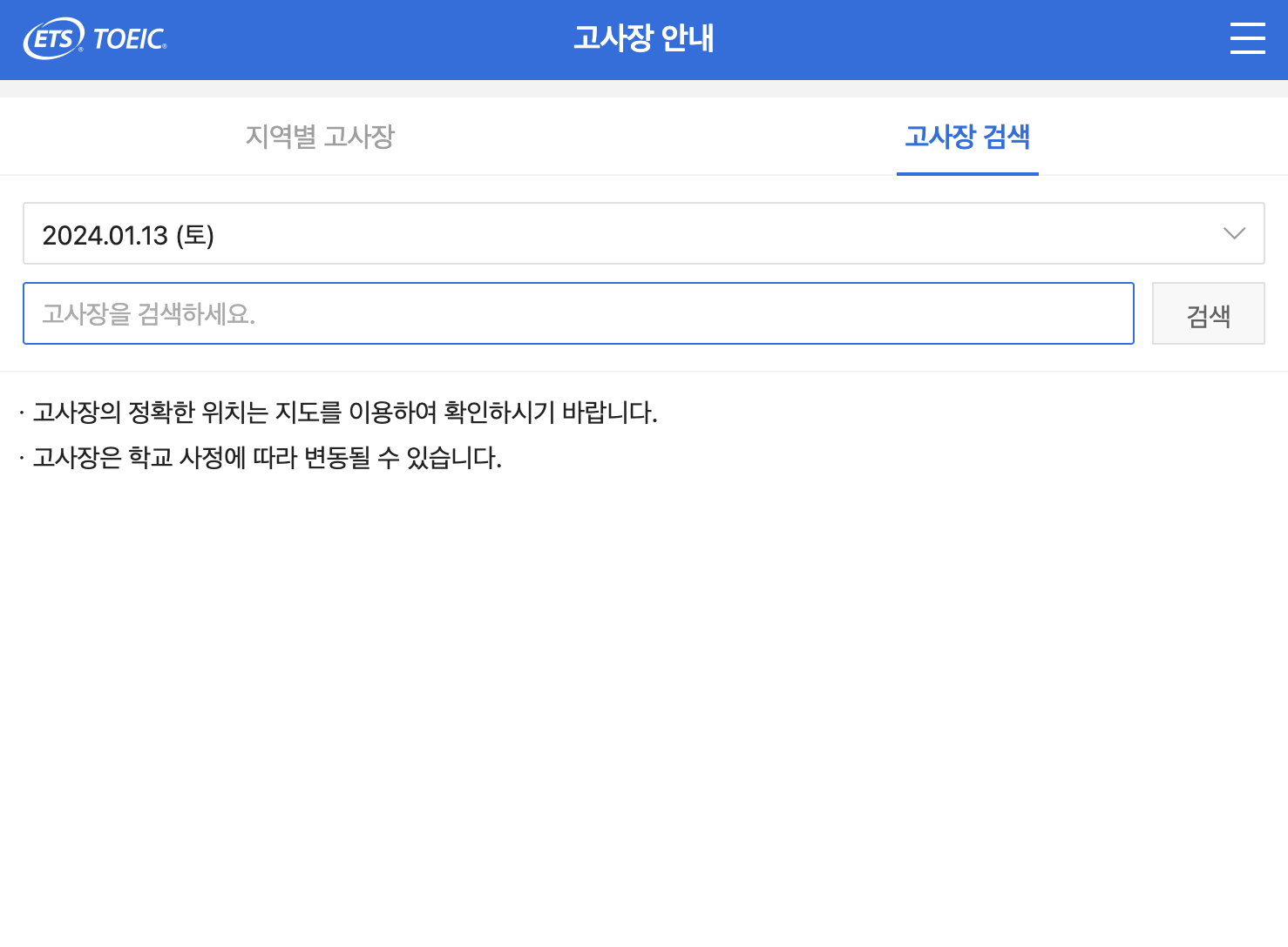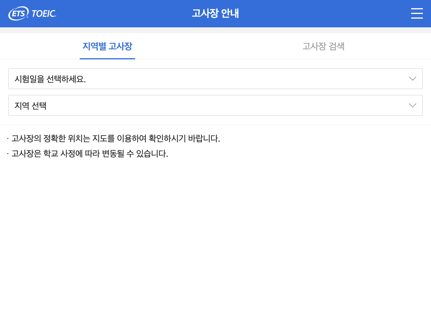 아래 사이트에서 지역별로 고사장을 검색하거나, 일자 선택한 후 고사자명을 검색하여 조회할 수 있습니다.