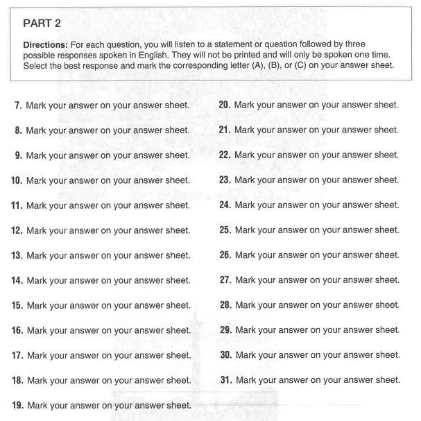 - 토익 파트2는 총 25개의 문제이며, 질문에 대한 알맞은 답변을 선택해야 합니다.