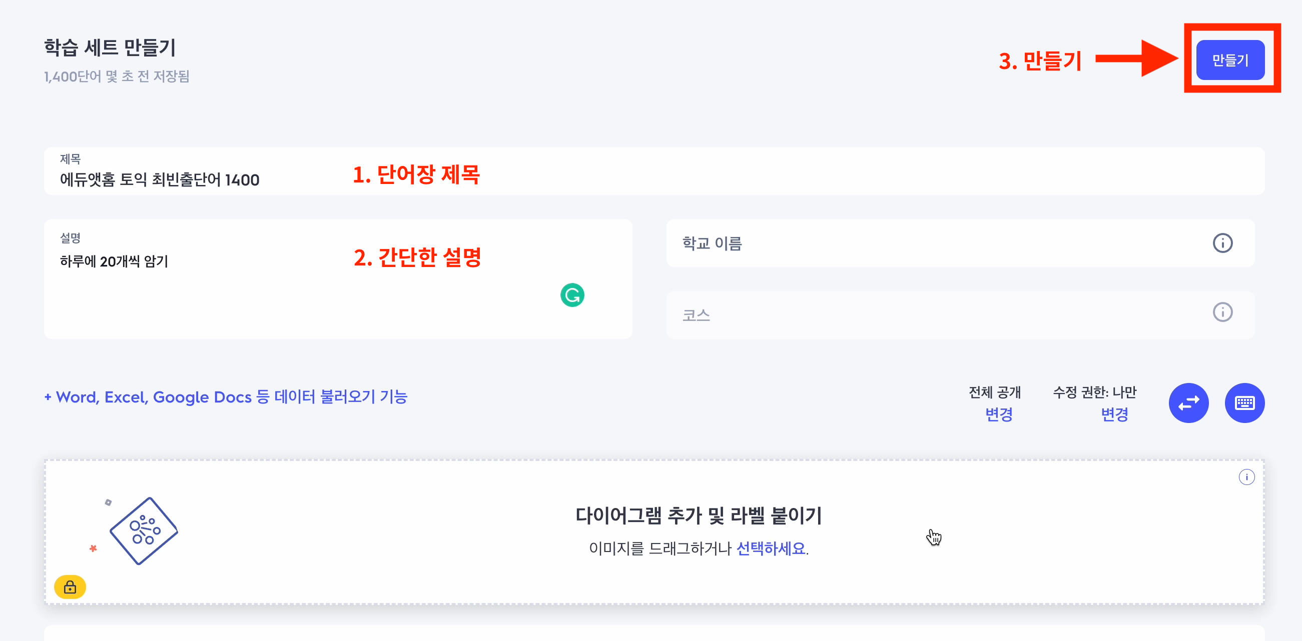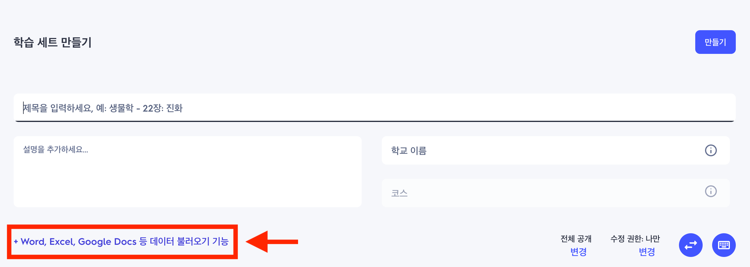 9. 학습 세트 정보를 입력한 후 보라색 '만들기' 버튼을 누릅니다.