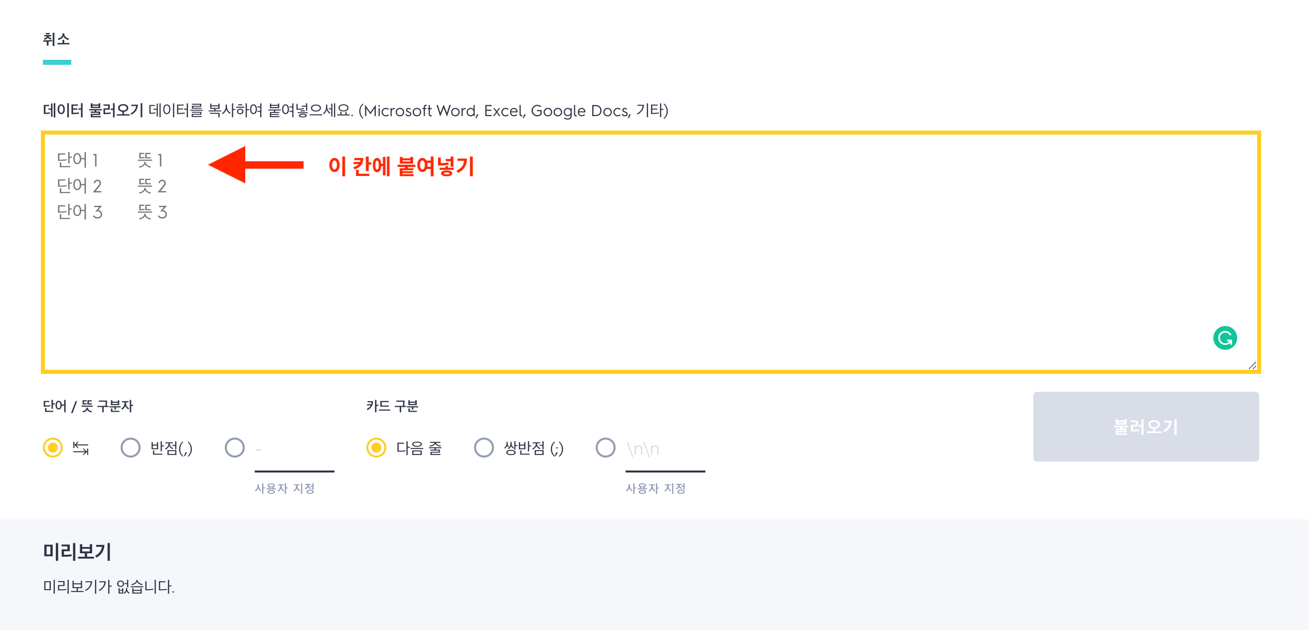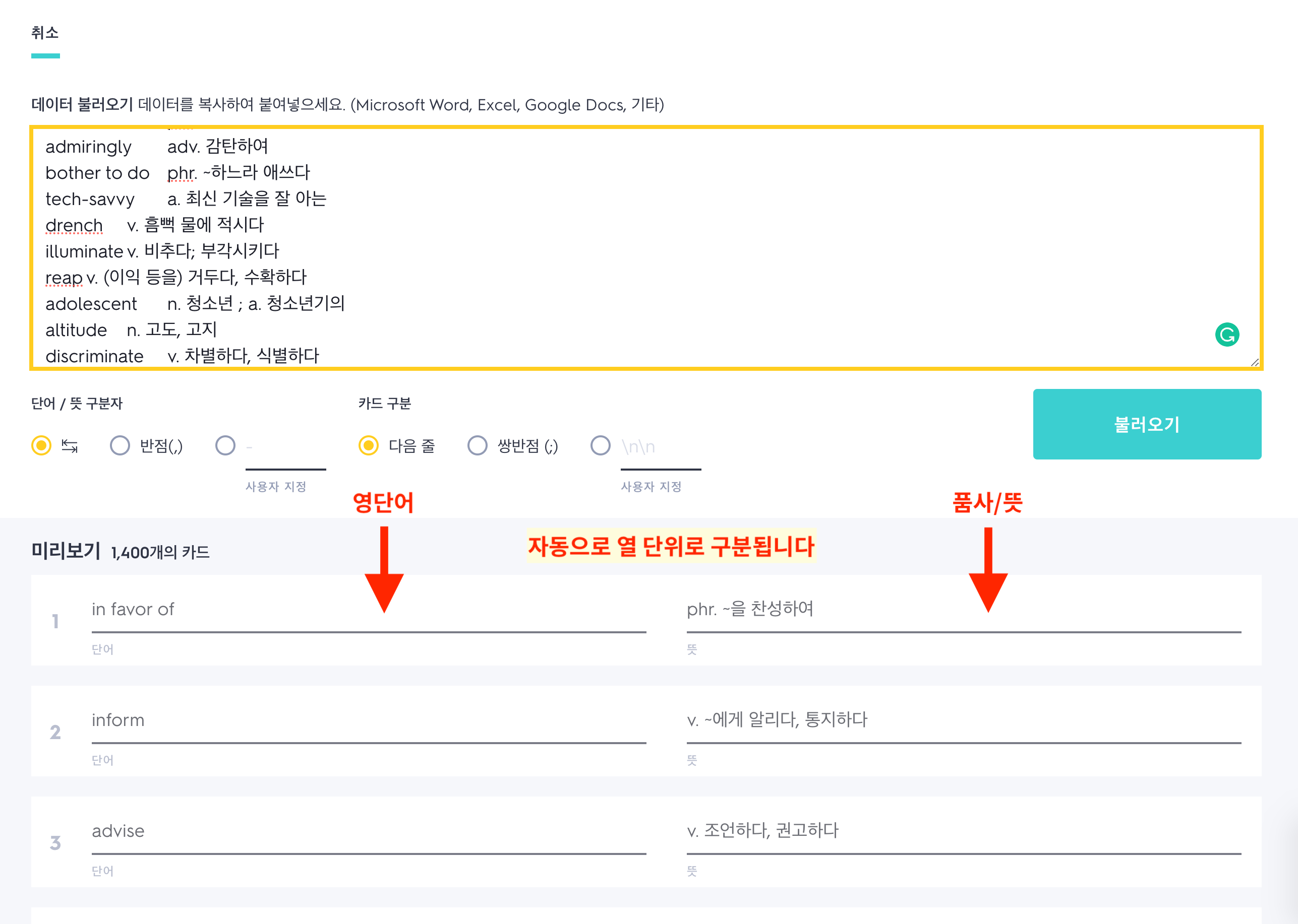8. 아래 미리보기를 통해 단어장이 잘 만들어진 것을 확인할 수 있습니다. 민트색 '불러오기' 버튼을 누릅니다.