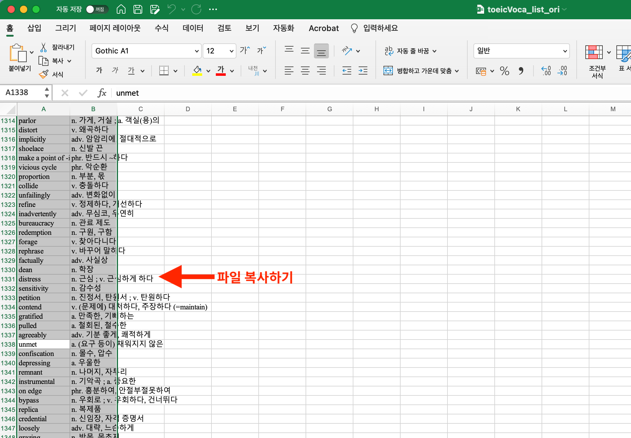 엑셀 파일이라면 단어 영역을 복사합니다. 아래 이미지의 엑셀 파일은 에듀앳홈 토익 최빈출 단어1400입니다. 퀴즐렛에 넣기 좋도록 1열에 영단어, 2열에 품사/뜻을 배치했습니다.