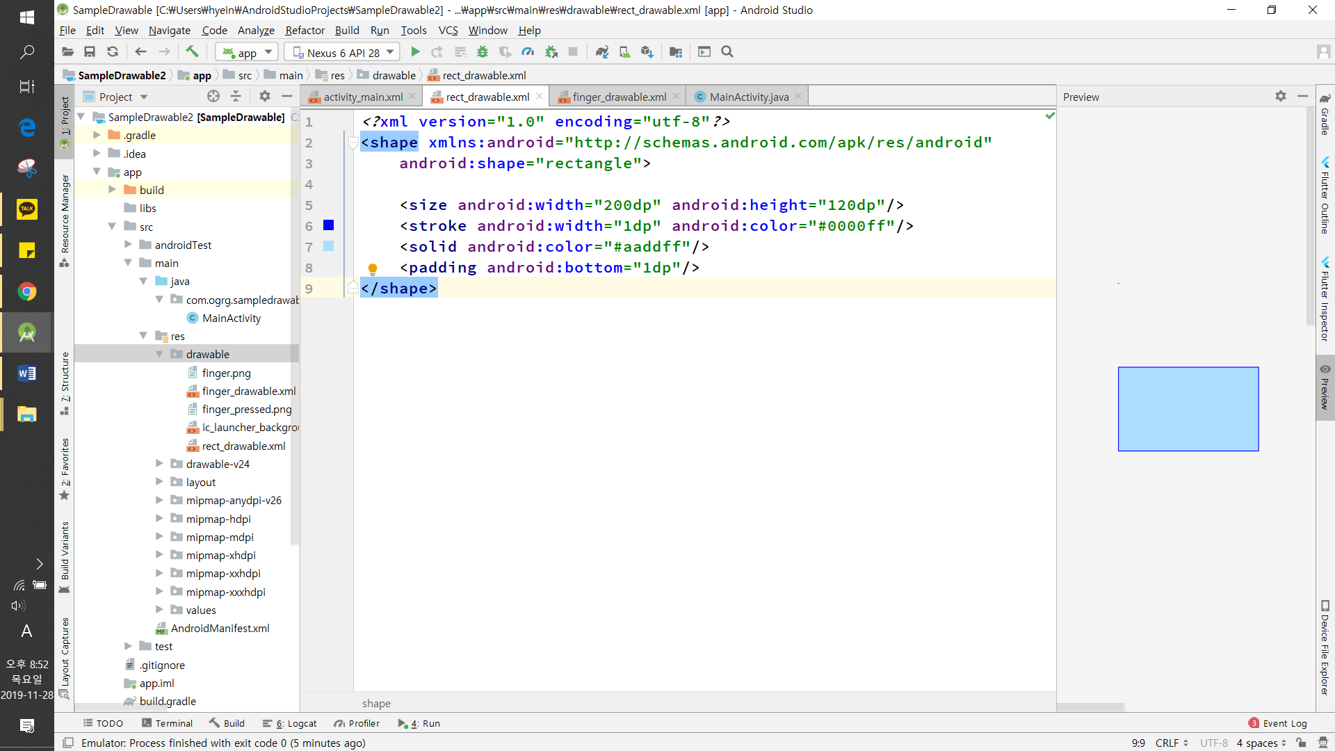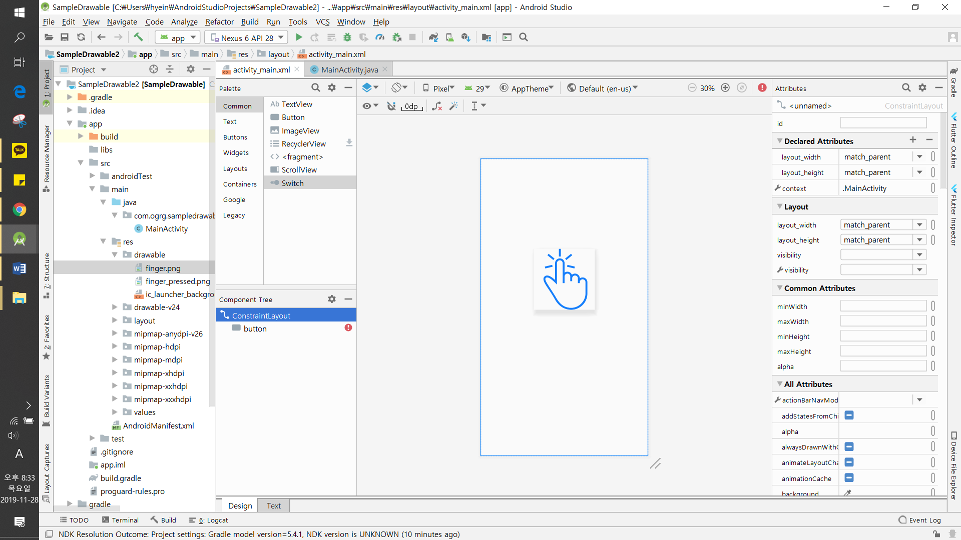 - 다음과 같이 코드를 작성하고, activity_main.xml 파일의 버튼의 background 속성의 값을 @drawable/finger_drawable로 변경