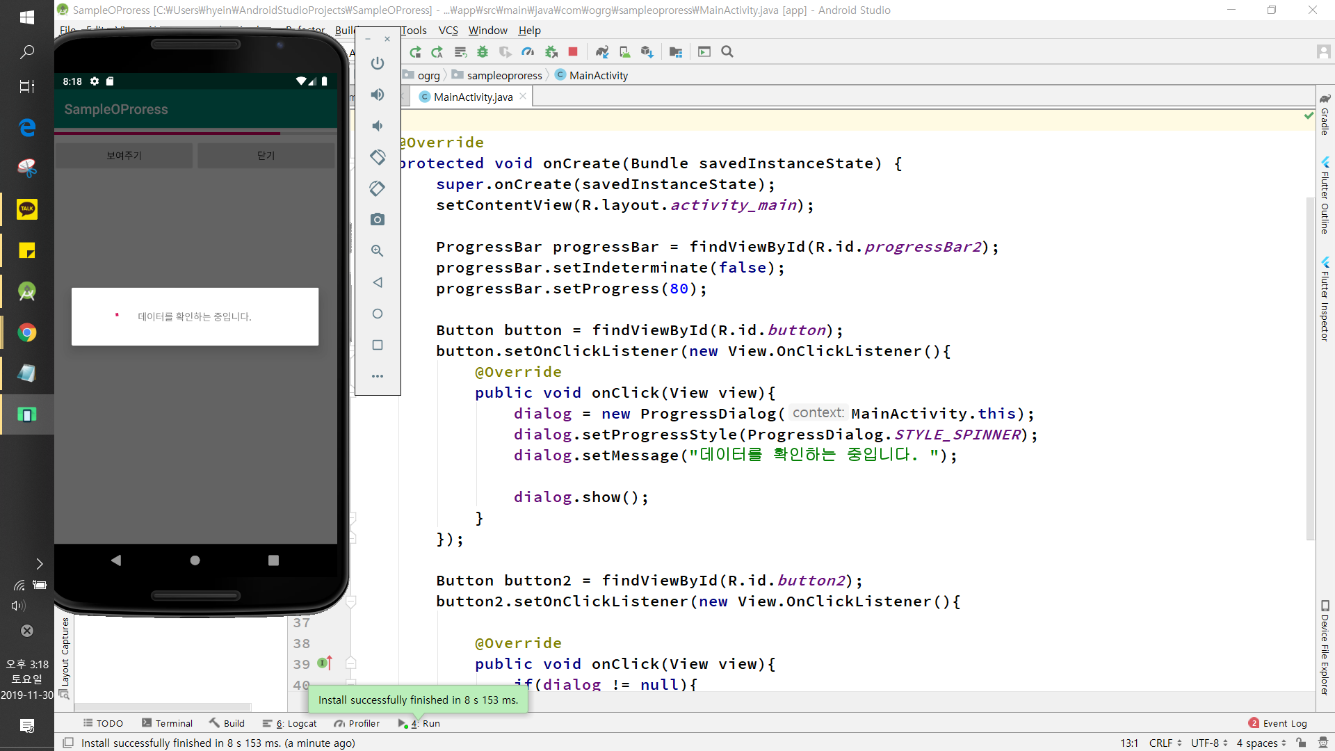 - 이렇게 만든 ProgressDialog 객체는 show() 메서드를 호출하면 화면에 표시