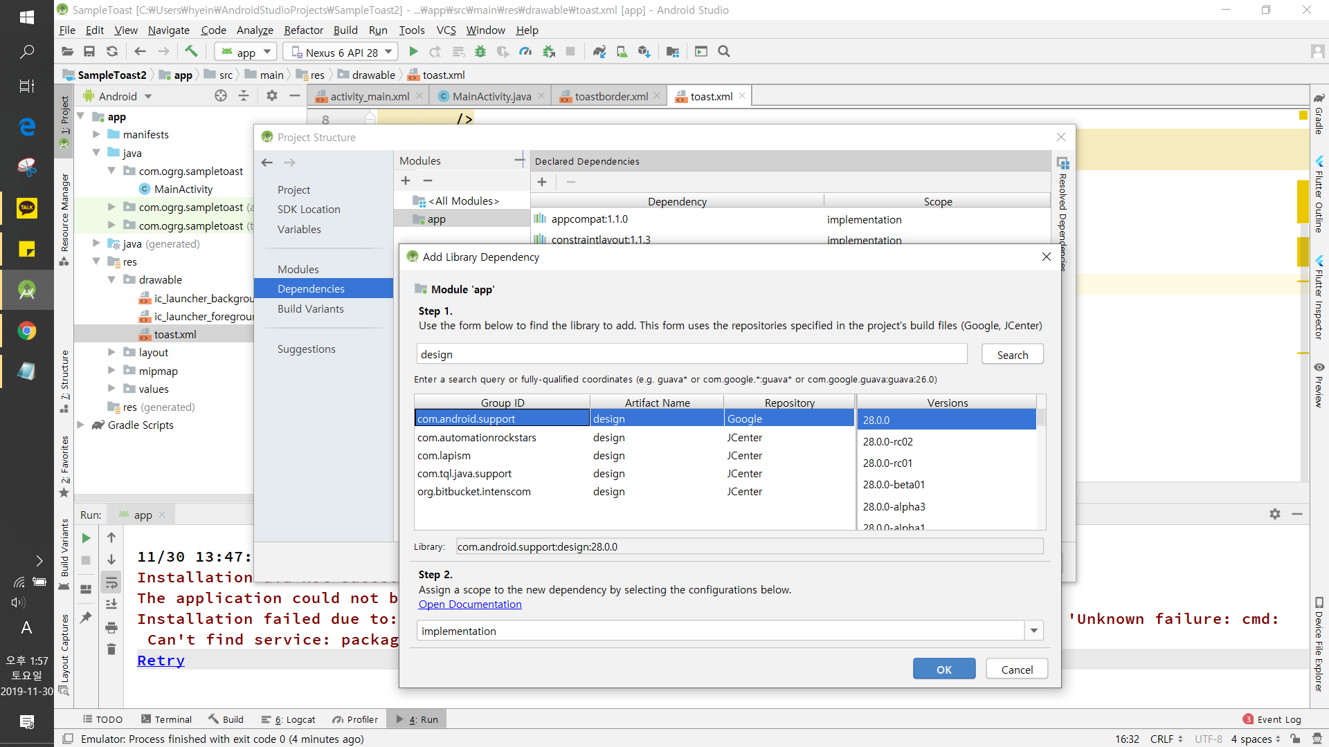 - 스낵바는 외부 라이브러리로 추가되었기 때문에 스낵바가 들어있는 디자인 라이브러리를 프로젝트에 추가해야 사용할 수 있다